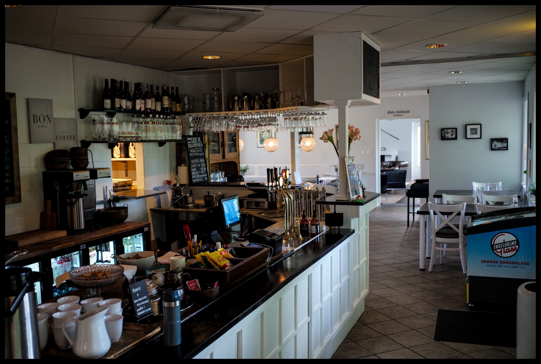 Efter 11:e hålet finns det en kiosk med toaletter. Inga toaletter utöver detta som vi såg. Kiosken var vid vårt besök obemannad, men bemannas som vi förstod det under högsäsong. Utbudet var ok – men ingen korv fanns. Detta ska dock finnas under säsong sas det. Däremot erbjöds Engelholmsglass. Världsklass. Eller Världsglass!