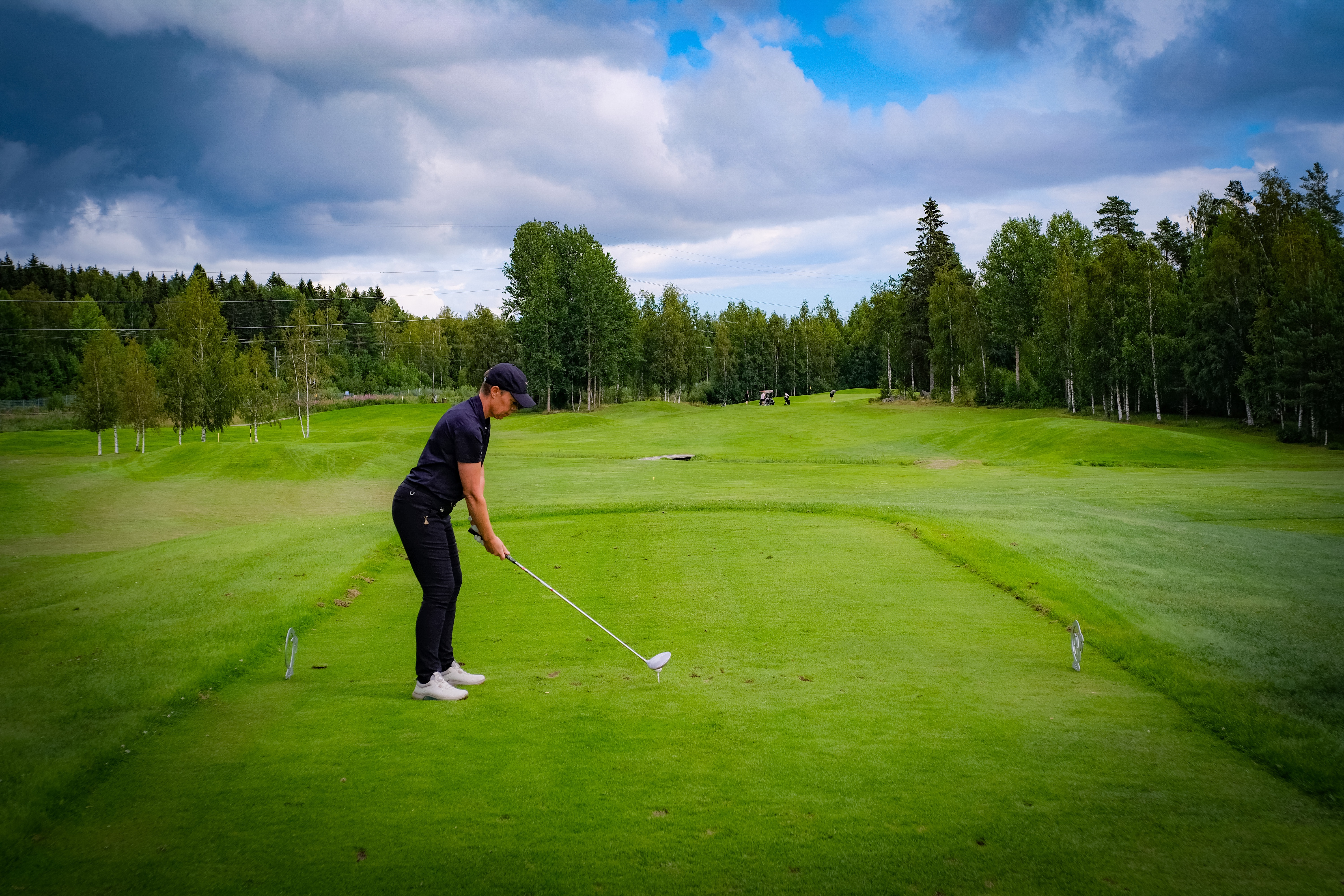Vi följde alla de omkringliggande åskcellerna via appar i telefonen och det såg ut som att det var spelbart, så vi körde igång. Banan är av park/skog karaktär med lätt böljande fireways. Vid vårt besök fanns det bitvis en del dåliga fairways partier i början, men känslan var att fairways över lag ändå var mycket fina. Även tee:s var rymliga och bra – men vissa var lite ojämna.