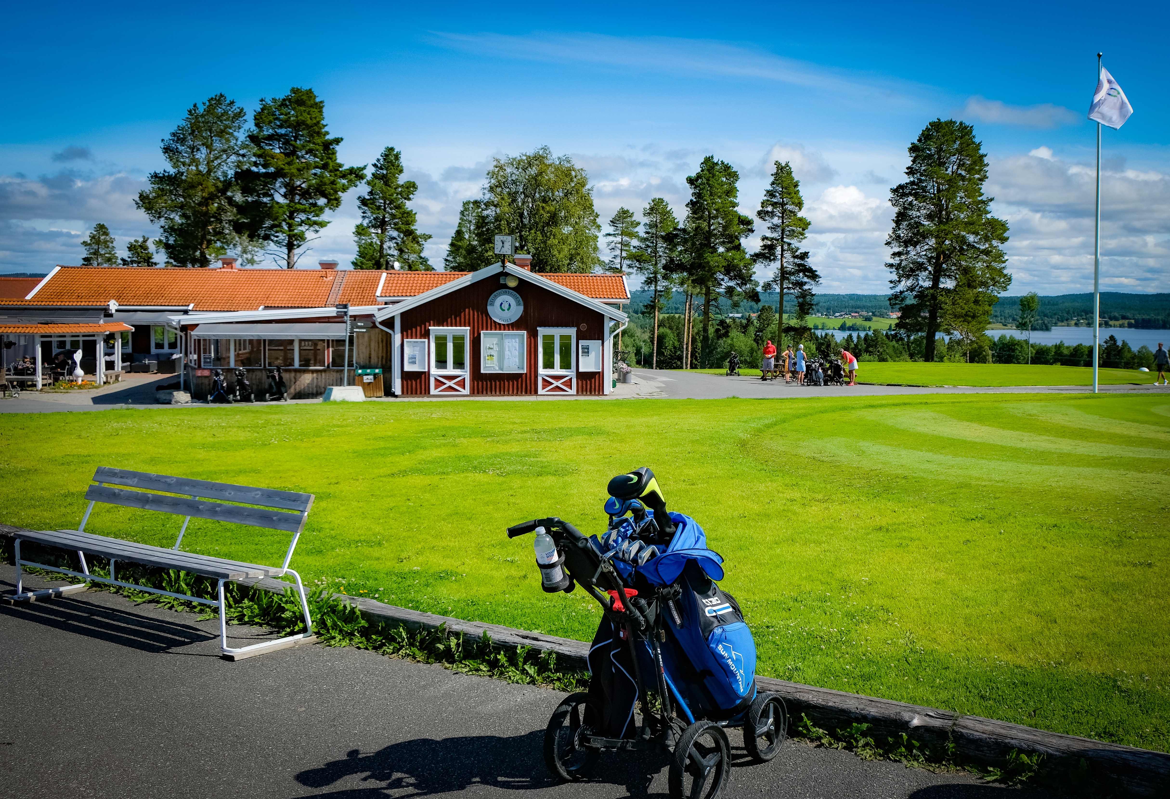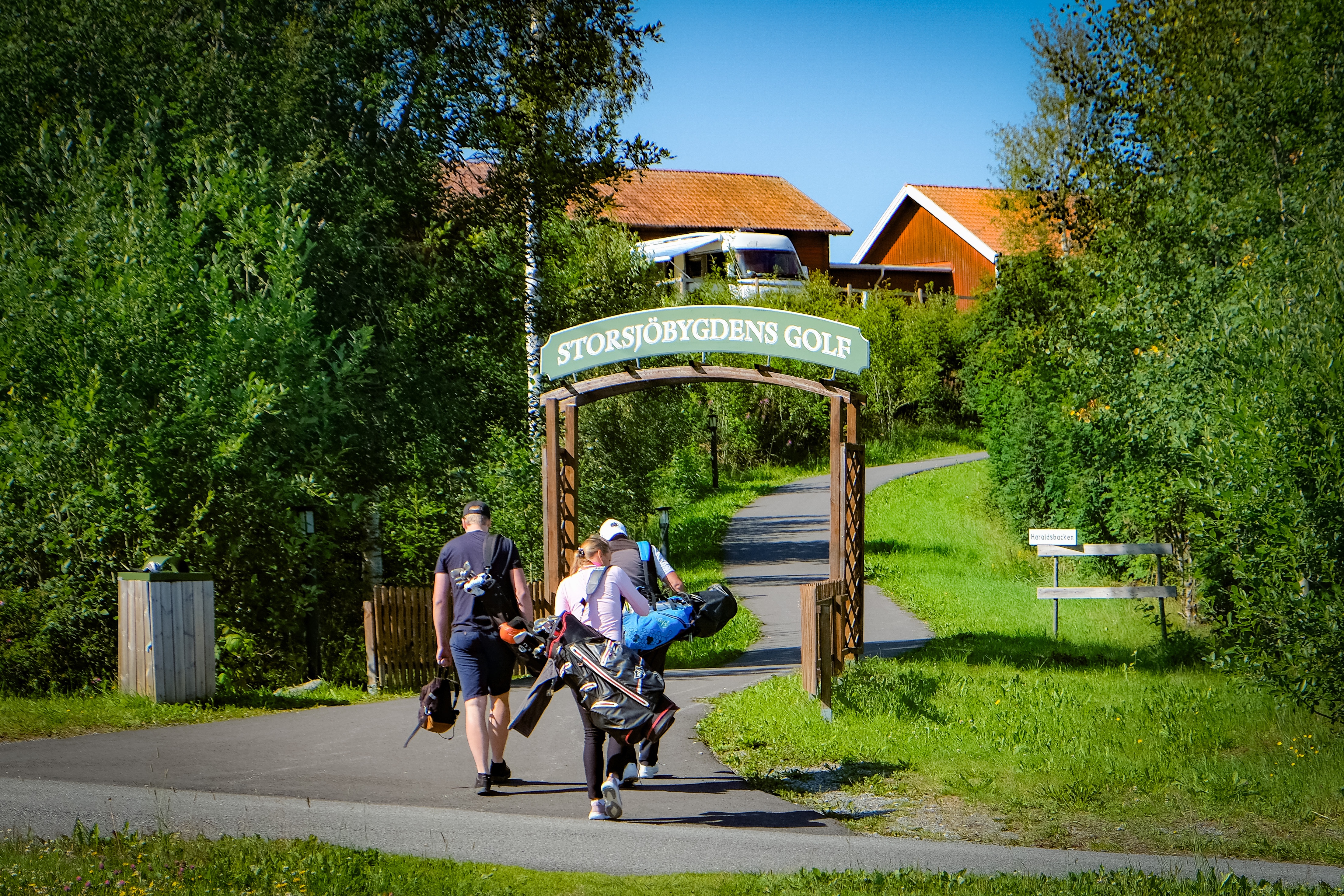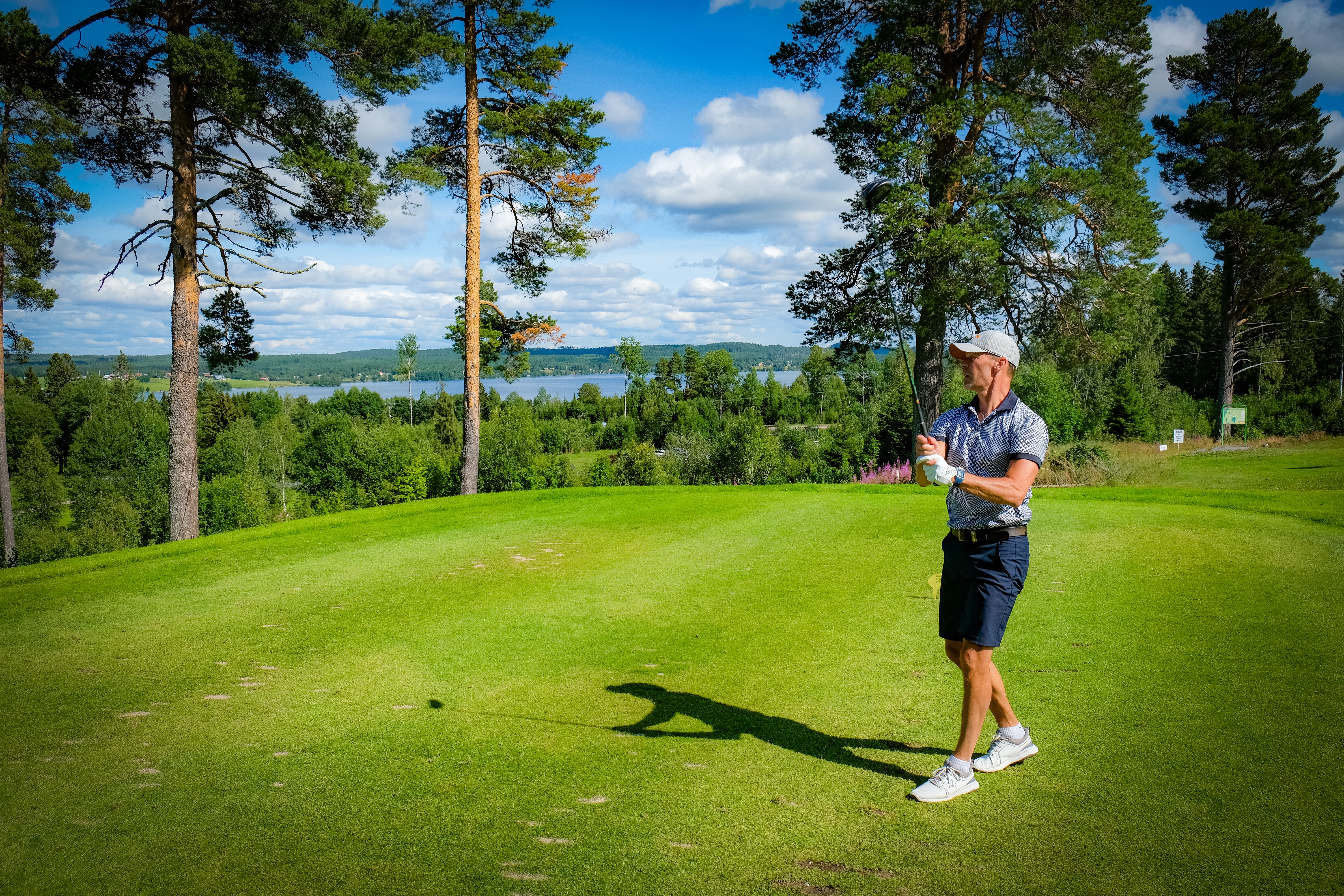Nästa stopp på vår semesterresa i golf-Sverige blev Storsjöbygdens GK. Ännu en gång råkade vi ut för en felaktig väderprognos – åt rätt håll. Det var utlovat moln hela eftermiddagen, men solen dominerade minst sagt. Ankomsten till klubben började med en rejäl uppförsbacke – lite av en försmak av banan.