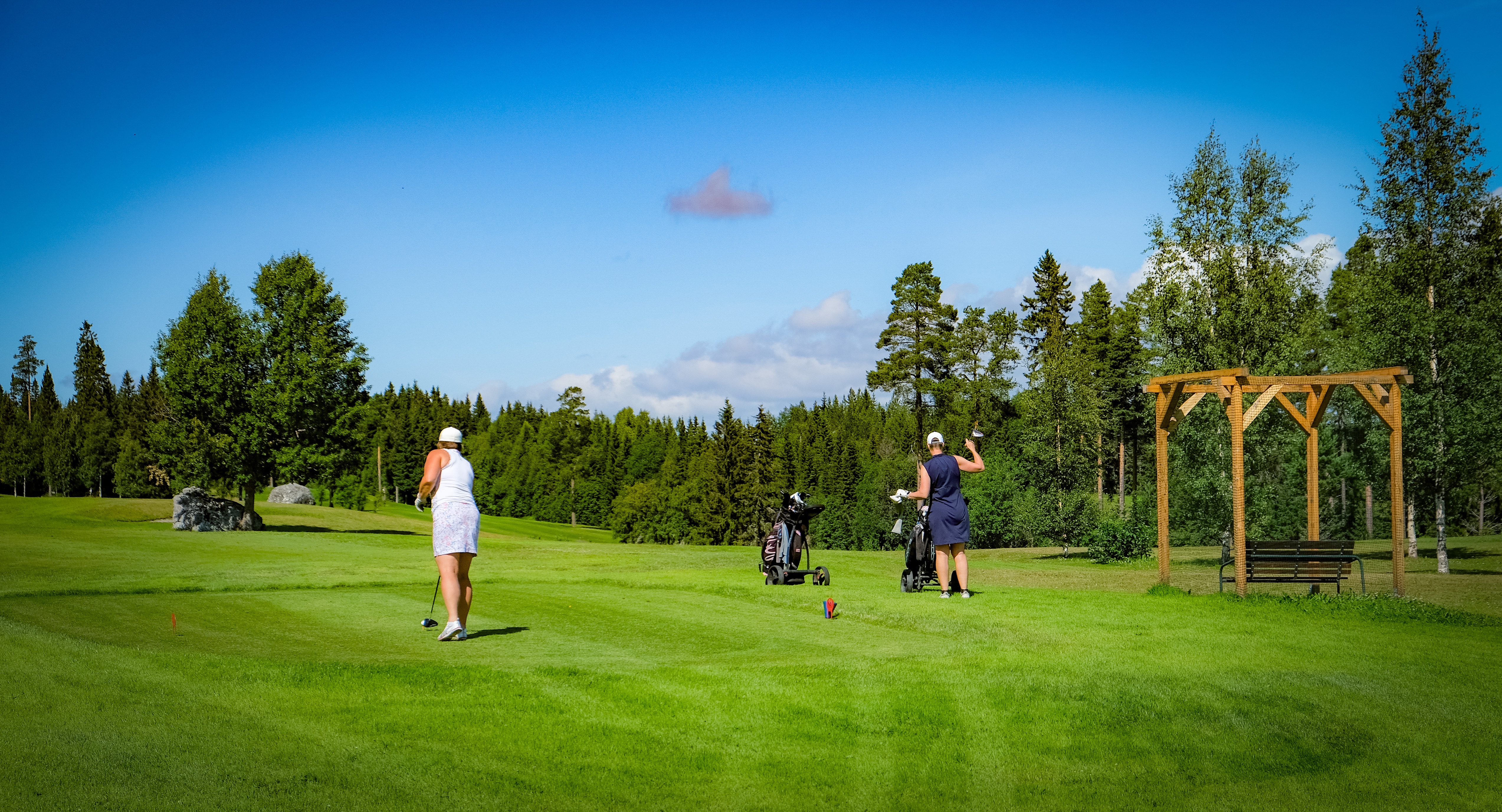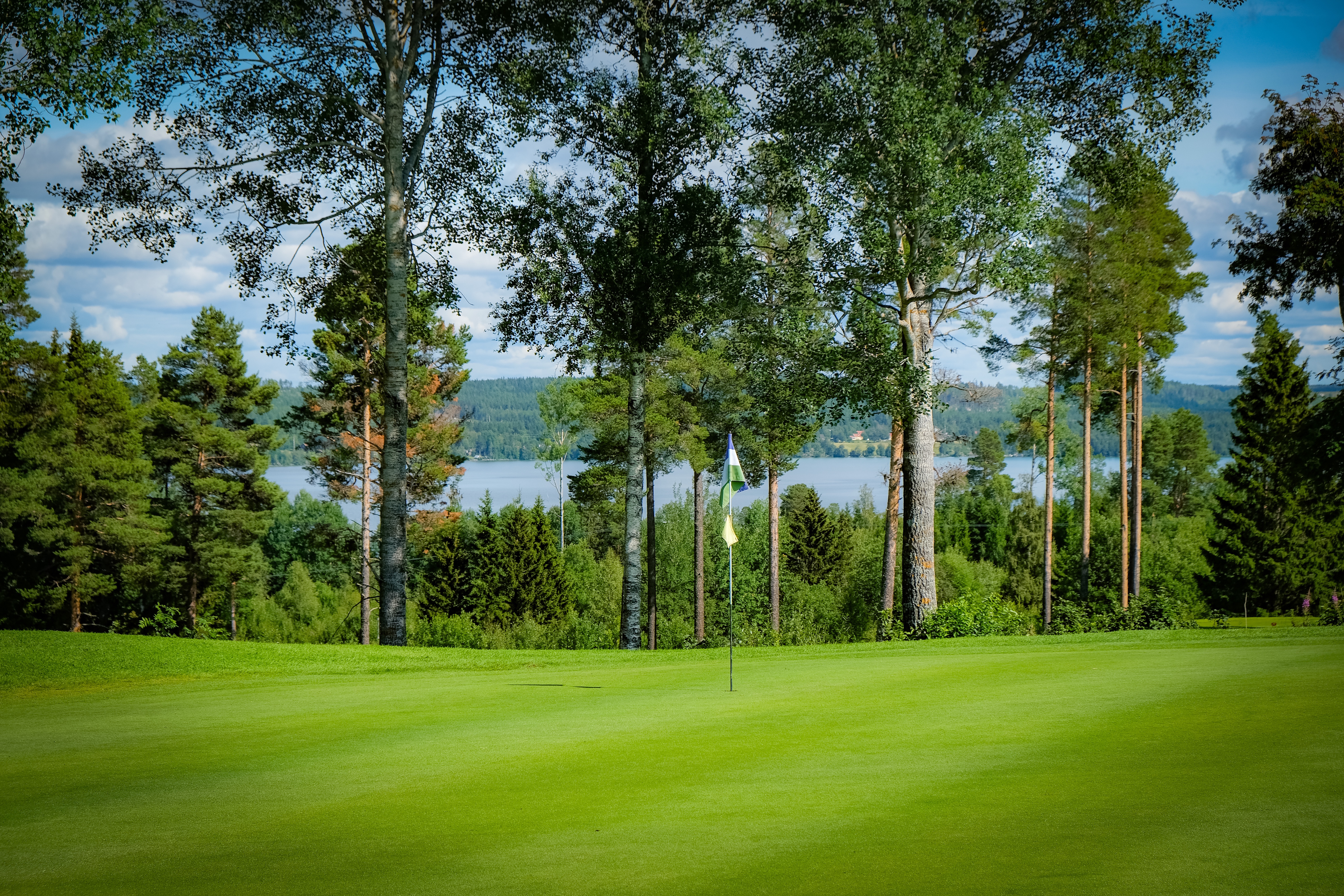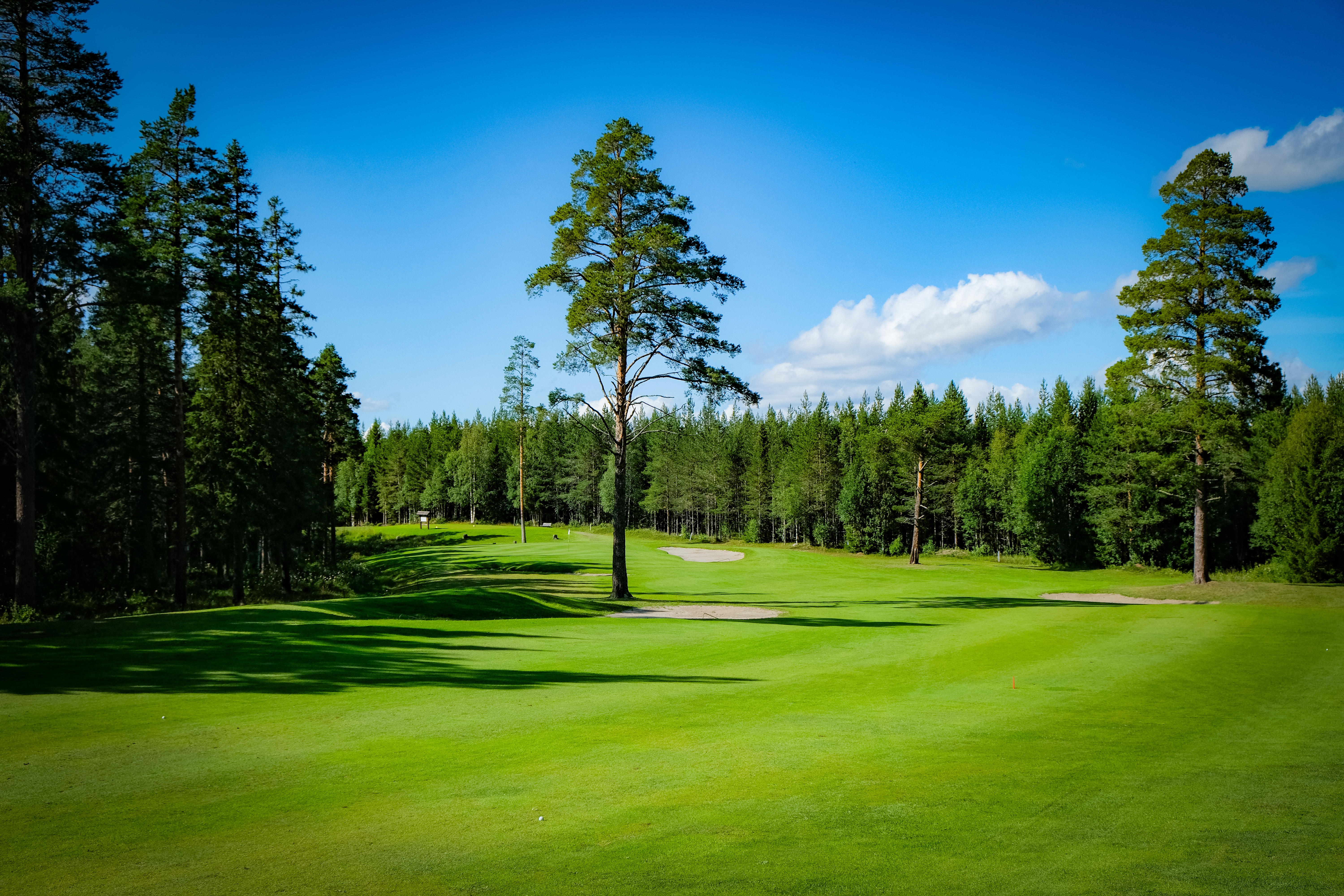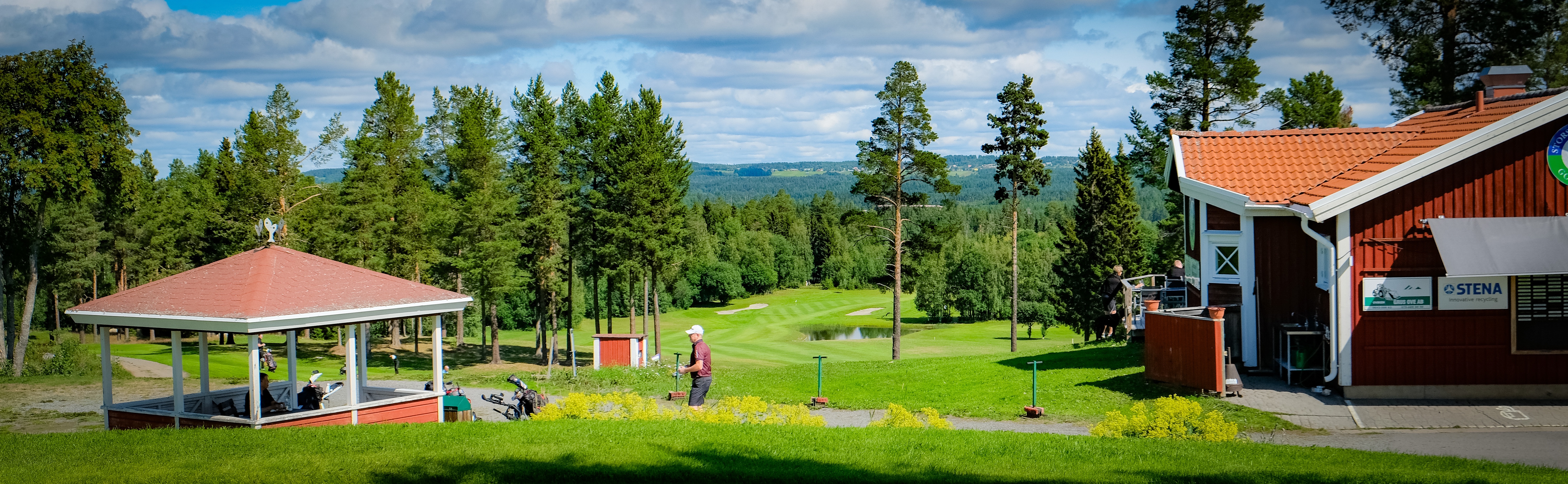 De första nio hålen började – uppför. I början tycker jag att banan är av parkmodell, för att senare gå över mer i skogsbana. Banskisser finns vid gul tee – inte vid röd. Däremot finns det bra ”burar” vid röd tee som skyddar vid utslag från gul. Detta blir dock lite motsatser – om man som dam går direkt till röd tee missar man ju banskissen. Var man än vände sig var det fantastiska vyer ut över det Jämtländska landskapet. Observera att flaggan är Jämtlands flagga…