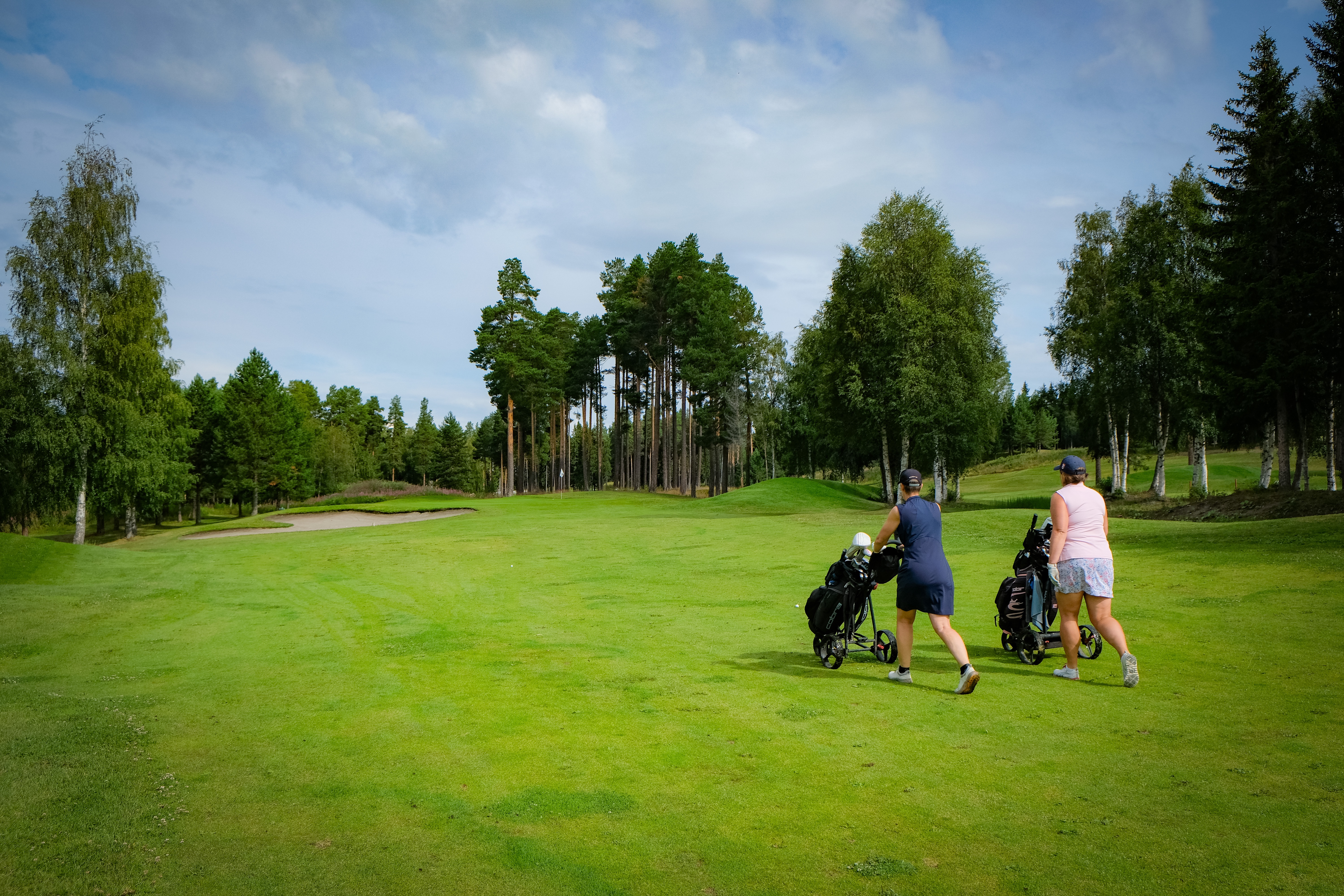 På hål åtta fanns en automat man kunde köpa fika i (tror jag – vi använde inte den). Tyckte kanske att den var lite underligt placerad. Efter hål åtta skulle vi som tänkte gå 18 hål vända ner till hål fyra igen. De som kom från från hål åtta hade företräde och då var det inte läge att sätta sig och fika. Däremot fanns det en bänk vid utslaget på hål sju…men där kändes det inte som att det var läge att fika på. Kanske det finns ett tänk för detta – men vi hade nog inte riktigt uppfattat det.