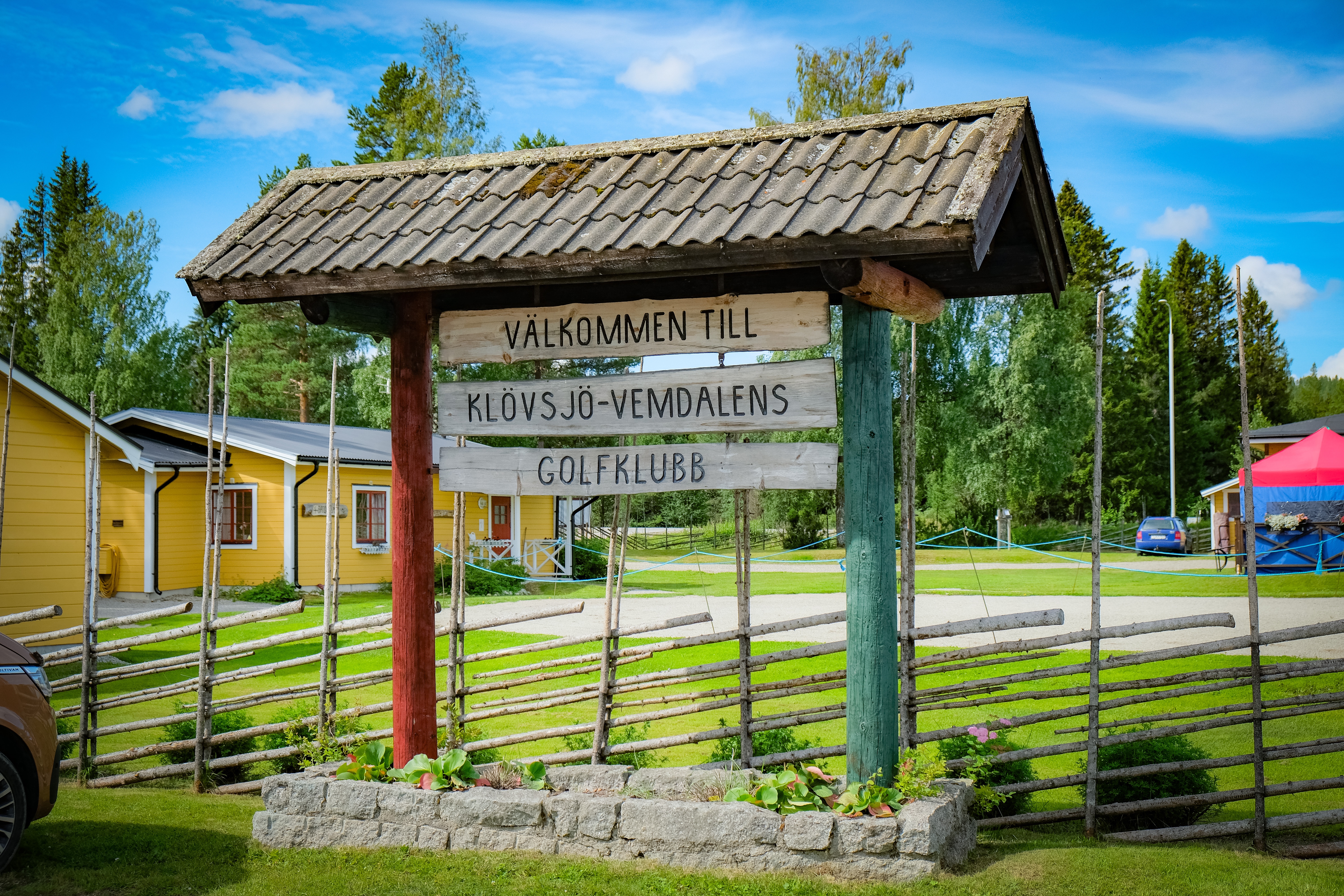 Sista stoppet på vår golfresa genom Sveriges mitt blev Klövsjö-Vemdalens GK. Resan till klubben gick genom ett fantastiskt landskap i vackert väder. Klubbens lokaler ligger i ett vägkors där restaurang & parkering ligger på en sida, klubblokal och övningsområde på en sida och själva banan på en tredje sida. Shopen och receptionen är liten men ändamålsenlig. Vi hade lite strul med ett av våra golf-amorekort och tyvärr var inte servicen helt på topp i receptionen, men det löste sig tillslut.